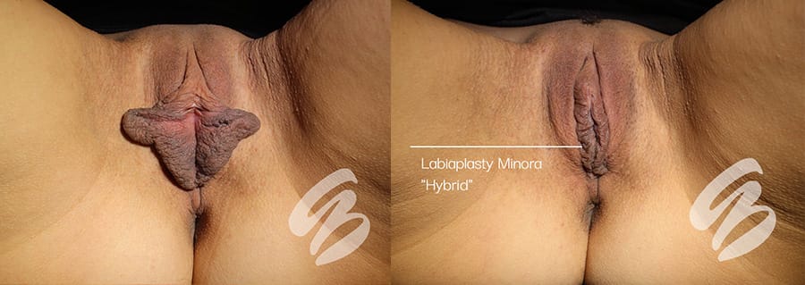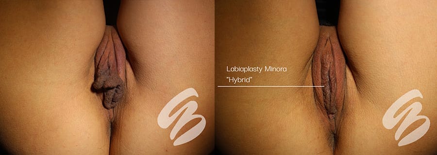 The Hybrid look combines the RIM and Barbie to leave a very fine, petite, natural looking hint of a rim around the vaginal opening. Less labia than a RIM look and more than a Barbie look. Approximately 1 cm of Labia Minora remains below the Labia Majora. A Clitoral Hood Reduction is often recommended when the Hybrid Labiaplasty is performed.